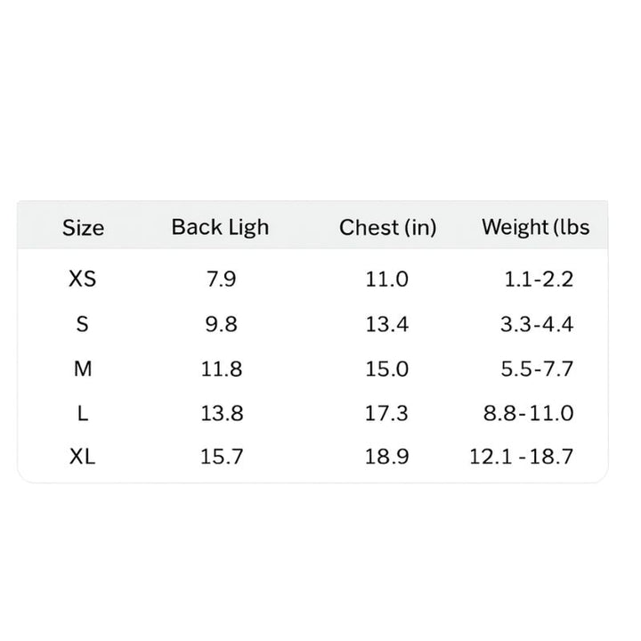 Measure your dog’s chest girth and back length before purchase